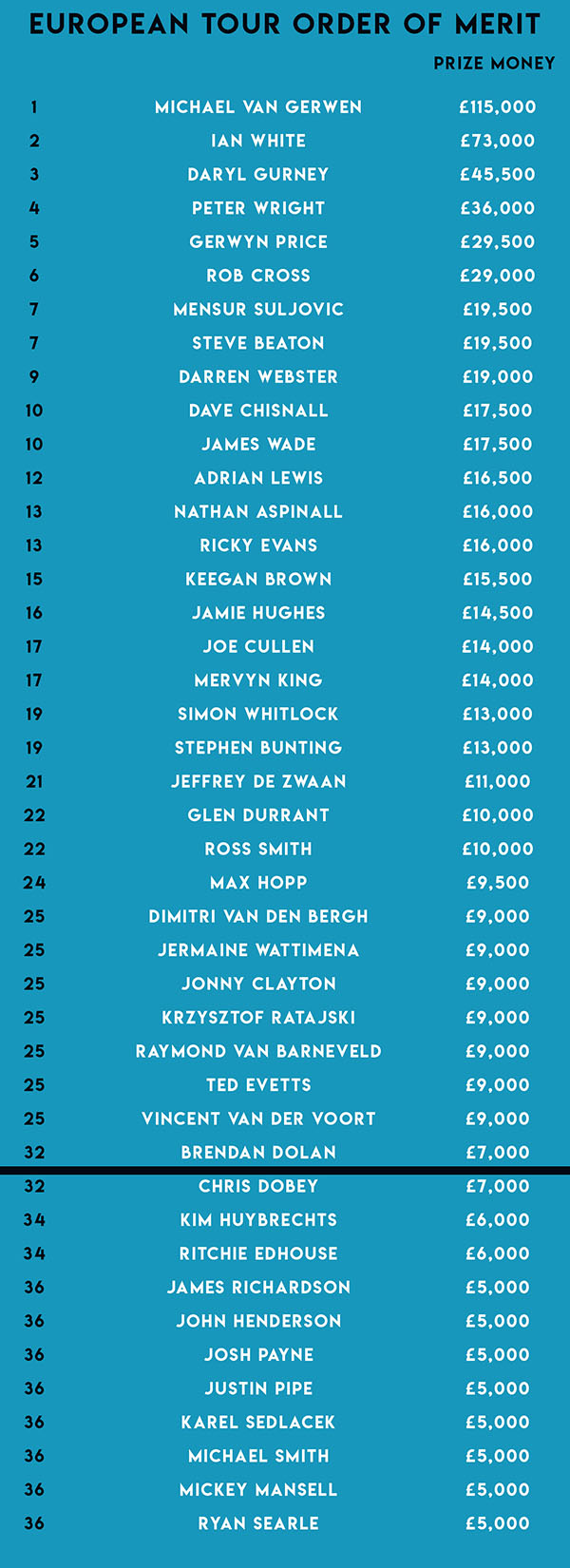 See below the PDC Main Order of Merit and European Tour Order of Merit as of May 28, 2019.