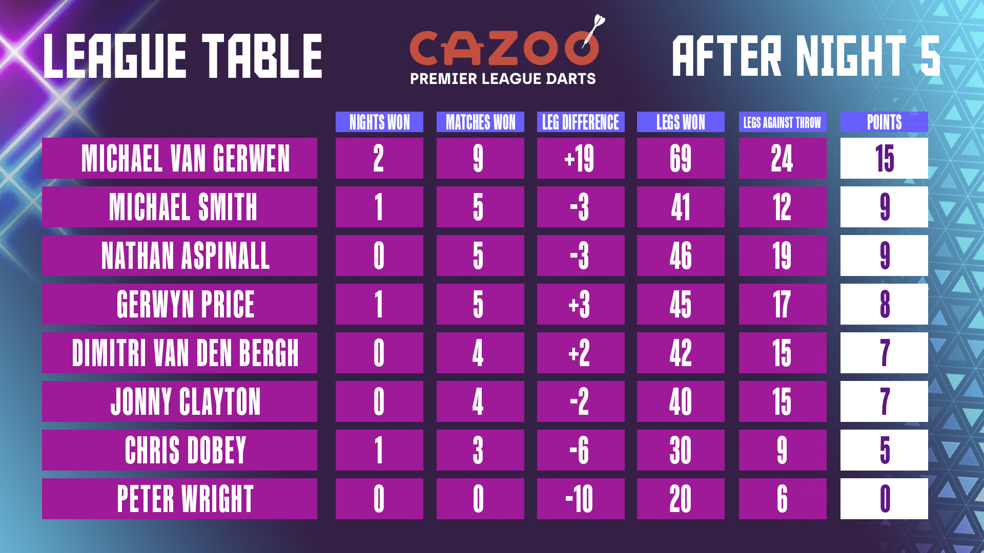 Michael van Gerwen extended his lead at the top of the Cazoo Premier League table with victory on Night Five in Exeter.